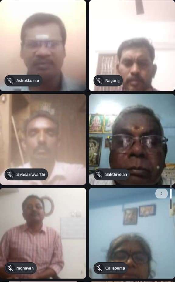 காரைக்கால் மாவட்ட தலைவர், வழக்கறிஞர் திருமுருகன் அவர்கள் இந்த கூகுள் மீட் நடத்துவதின் அவசியம் மற்றும் எல்லோரும் சந்திக்க கூடிய ஒரு களமாகவும் அமைந்துள்ளதாகவும் எதிர்கால செயல்பாடுகள் பற்றிப் பேசினார். புதுச்சேரி மாவட்ட பொதுச்செயலாளர் திரு.N.விஸ்வநாதன் அவர்கள் கலந்து கொண்ட அனைவரையும் அறிமுகப்படுத்தியும், செயல் திட்டங்கள் பற்றியும் பேசினார். மற்றும் யூனியன் பிரதேச துணைத் தலைவர் N.வெங்கடாசலபதி அவர்கள் ஒரு சங்கம், கூட்டமைப்பு நடத்த வேண்டும் என்றால் அதற்கு எந்த அளவிற்கு சந்தா அவசியம் என்பதையும் தெளிவுபடுத்திப் பேசினார். மேலும் இக்கூட்டத்தில் நிர்வாகிகள் திரு.சக்திவேலன், திரு.சிவசக்கரவர்த்தி, திரு.சுந்தரமூர்த்தி, திருமதி.விஜயலட்சுமி, திருமதி.ராணிதேவா, திரு.தங்கவேல் ஆகியோரும் முதலியார்பேட்டை மண்டலத் தலைவர் திரு.ஜெ.சங்கர், மகளிர் அணி தலைவி திருமதி.மகாலட்சுமி ஆகியோர் உறுப்பினர்கள் ஆர்வத்துடன் வந்து சேர இருப்பதாகவும் தெரிவித்தார்கள். மாவட்ட நிர்வாகி திருமதி.சித்ரலேகா அவர்கள் அவருடைய ஆன்மீக அமைப்பில் இருந்து 25 மகளிர்கள் ஆர்வத்துடன் இணைய இருப்பதாக தெரிவித்தார்.
