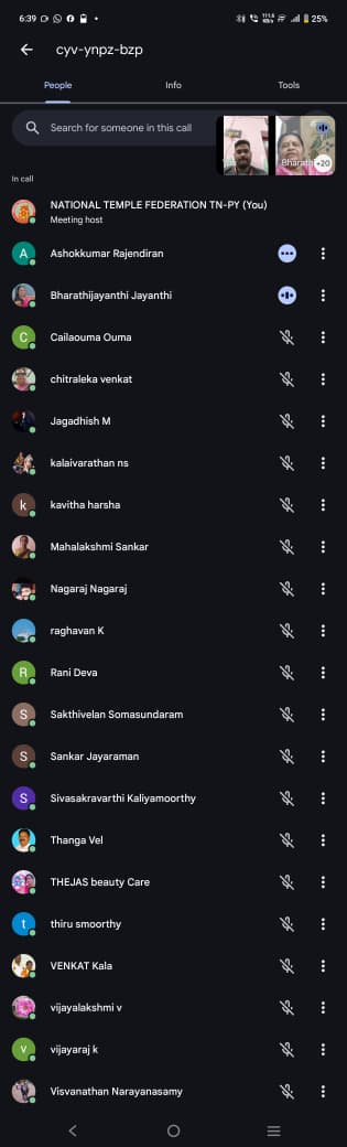 அனைவருக்கும் வணக்கம். தேசிய திருக்கோயில்கள் கூட்டமைப்பின் தலைவர், மத்திய அரசின் சட்ட ஆலோசகர் முனைவர் பி.இராமஸ்வாமி அவர்கள், தேசியப் பொதுச் செயலாளர் திரு.சந்திரபோஸ் பெருமாள் அவர்கள், செயலாளர் திரு.சு.பா.ஞானவேல் சரவணன் அவர்கள் ஆகியோரின் வழிகாட்டலுடன் நம் தேசிய திருக்கோவில் கூட்டமைப்பு தமிழ்நாடு புதுச்சேரி, இன்னும் ஒரு சில மாநிலங்களிலும் சிறப்பாக நடைபோட்டுக் கொண்டிருக்கிறது. இந்நிலையில் 08.01.2026 அன்று முதன் முதலாக நம் தேசிய திருக்கோயில் கூட்டமைப்பின் புதுச்சேரி யூனியன் பிரதேச தலைமை நிர்வாகிகள், புதுச்சேரி, காரைக்கால் மாவட்ட நிர்வாகிகள் ஆலோசனைக் கூட்டத்தை google மீட் வழியாக நடத்தினோம். இதற்கு திருமதி.வைஜெயந்திராஜன் அவர்கள் ஏற்பாடு செய்த போது எந்த அளவிற்கு இது செயல்படுத்த முடியும் என்கின்ற எண்ணத்துடன் தான் செயல் பாட்டில் இறங்கினேன். ஆனால் அத்தனை நிர்வாகிகளும் மூன்று நாட்களுக்குள் செய்த ஏற்பாட்டில் மிகப்பெரிய ஆர்வத்துடன் வந்து இணைந்து நிகழ்ச்சியைச் சிறப்பித்தது மட்டுமல்லாமல் தங்களுடைய கருத்துக்களை தெளிவாகவும், ஆக்கபூர்வமாகவும் பகிர்ந்தார்கள்.