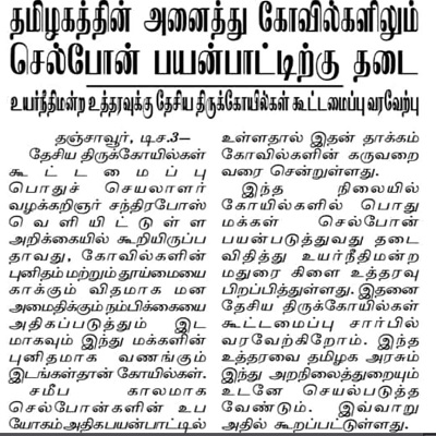 National Temple Federation,Cell phone use banned in all temples in Tamil Nadu