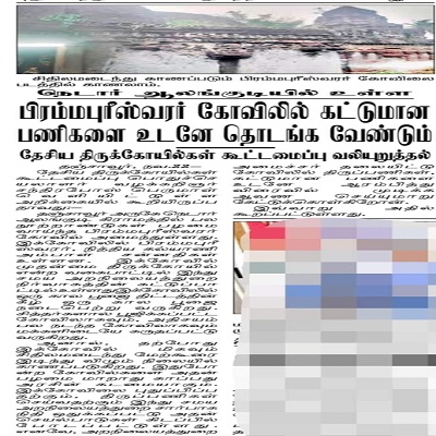 National Temple Federation,Construction work on Brahmapureeswarar temple should begin immediately